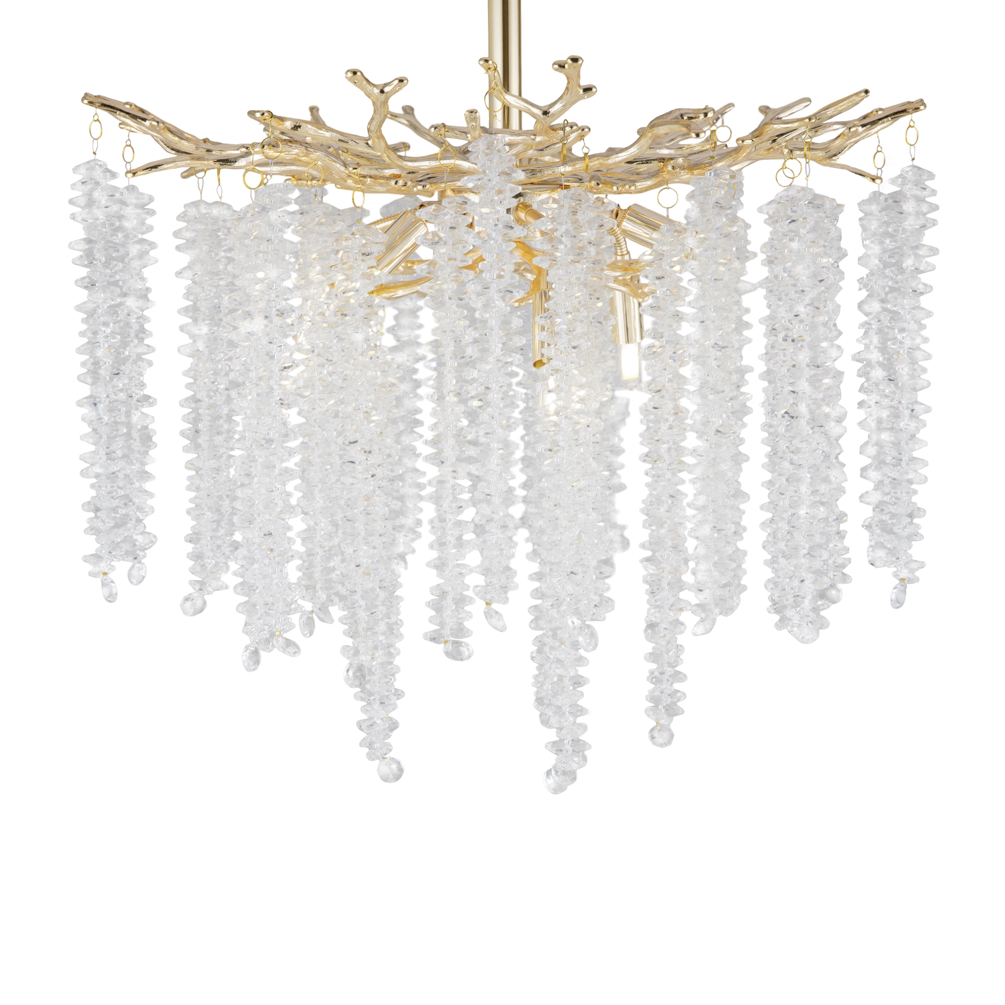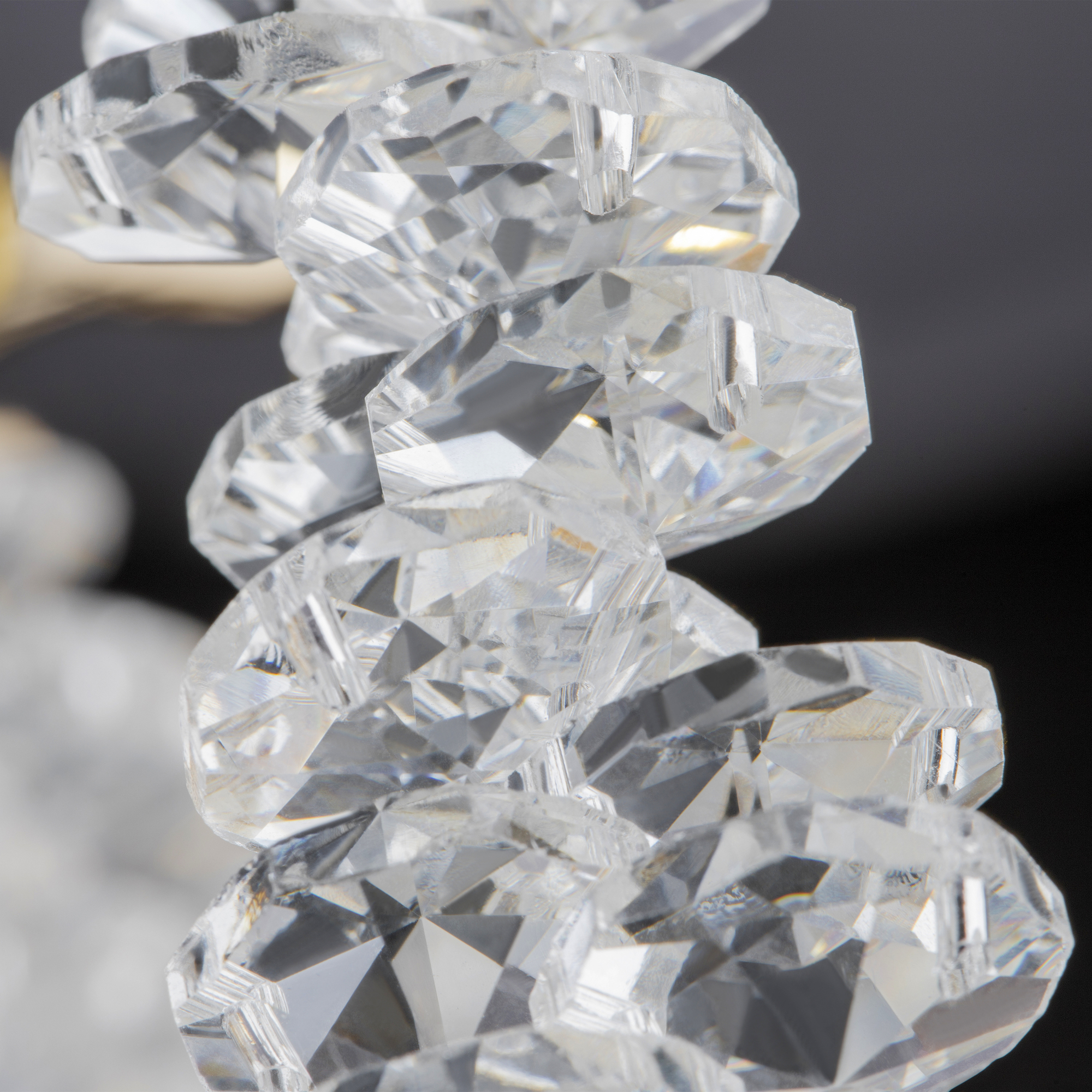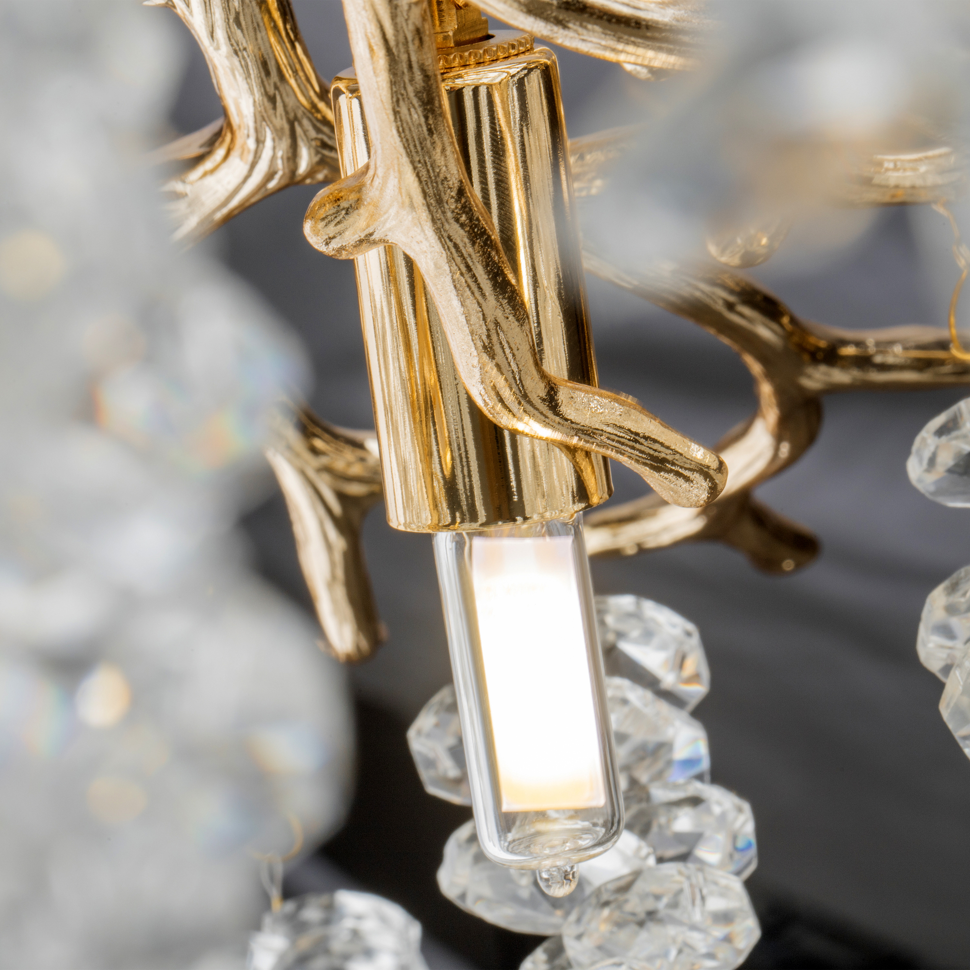 Материалы арматуры —металл, цвет — золото. Хрустальные декоративные элементы напоминают капельки - создают глубокие переливы света. Дизайн в трендовой растительной тематике. Источник света — лампа с цоколем G9 и с поворотной функцией.