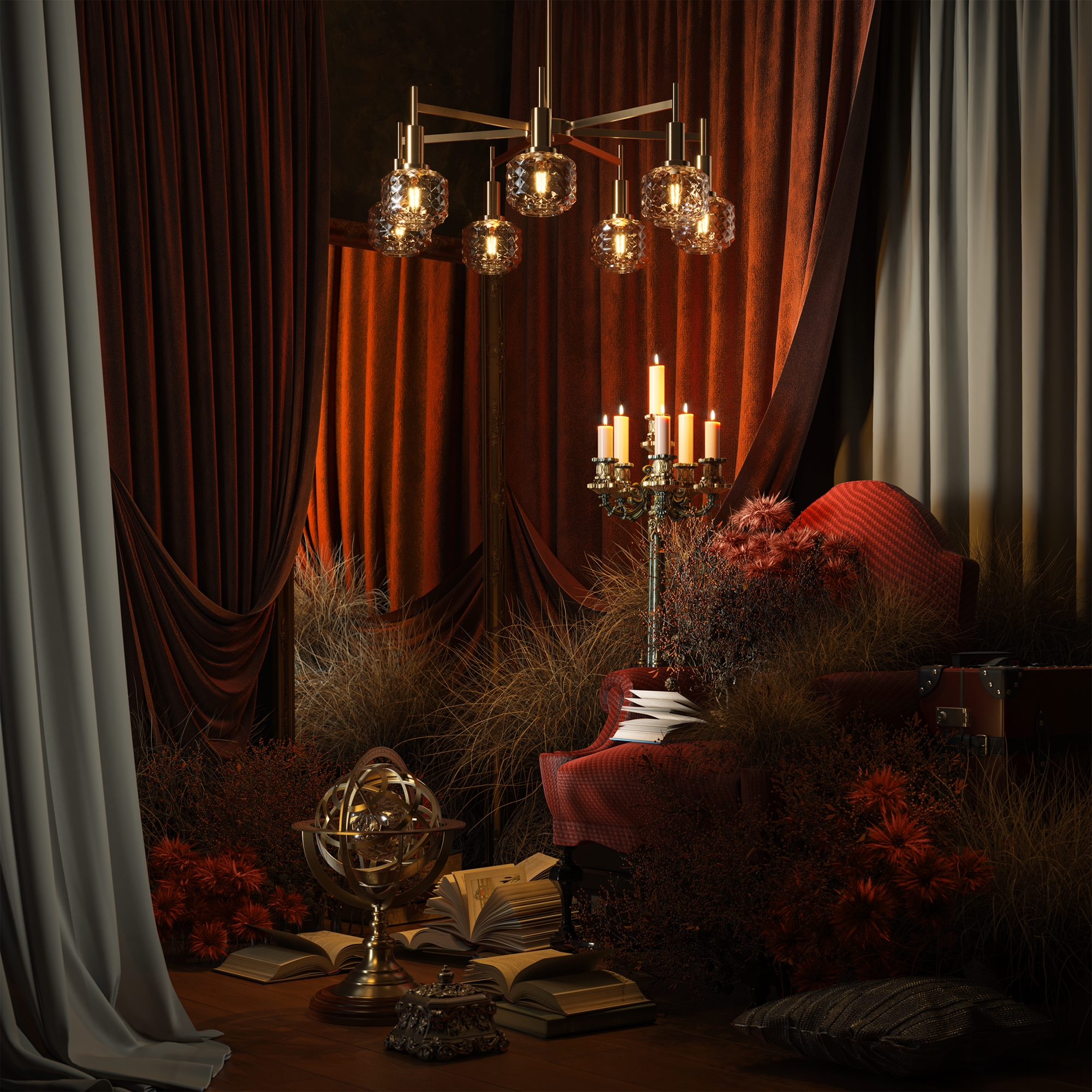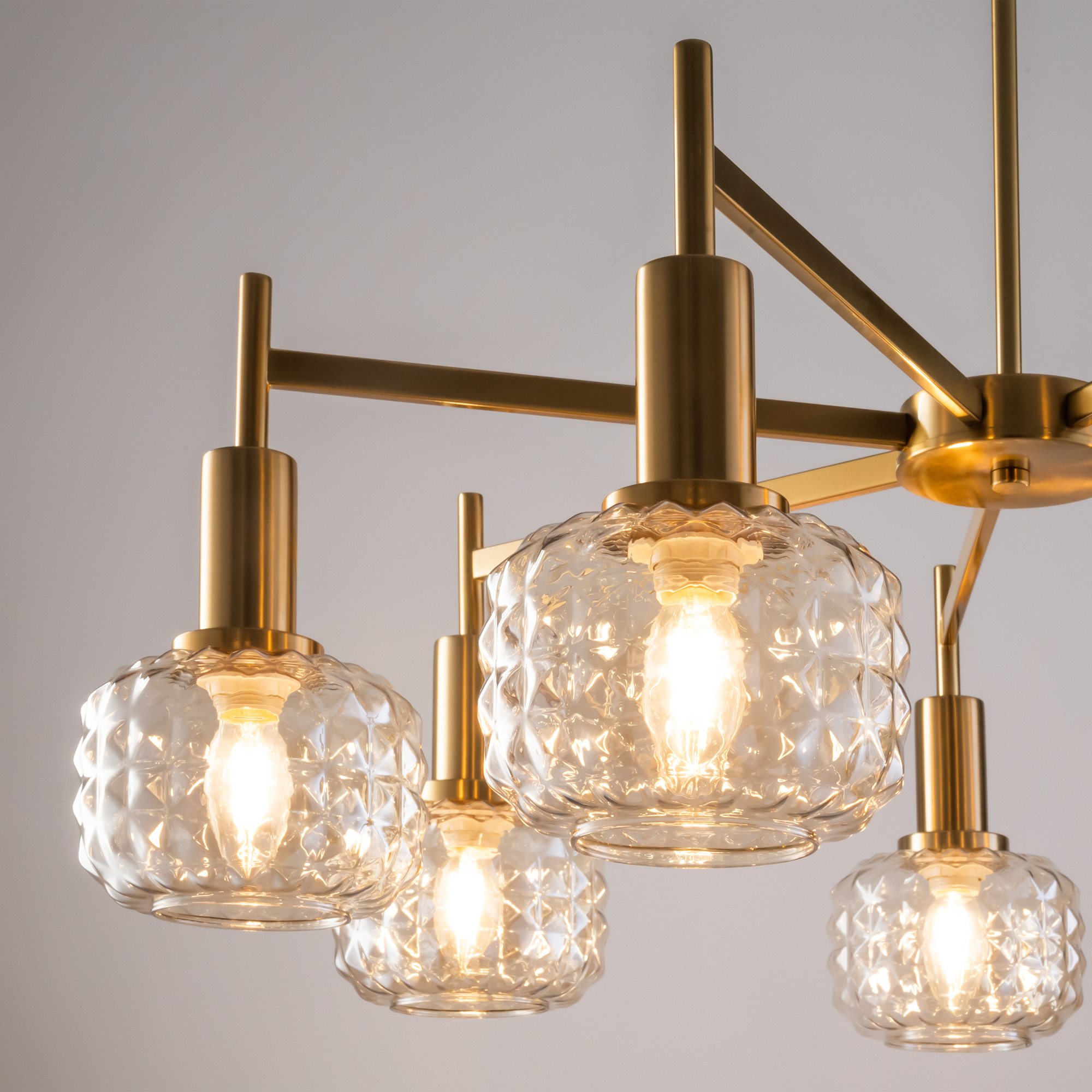 Металлическая арматура в цвете латунь. Плафоны из толстого рельефного стекла в оттенке амбра с «шипованной» огранкой. Подвесные модели регулируется по высоте. Источник света - лампа с цоколем Е14