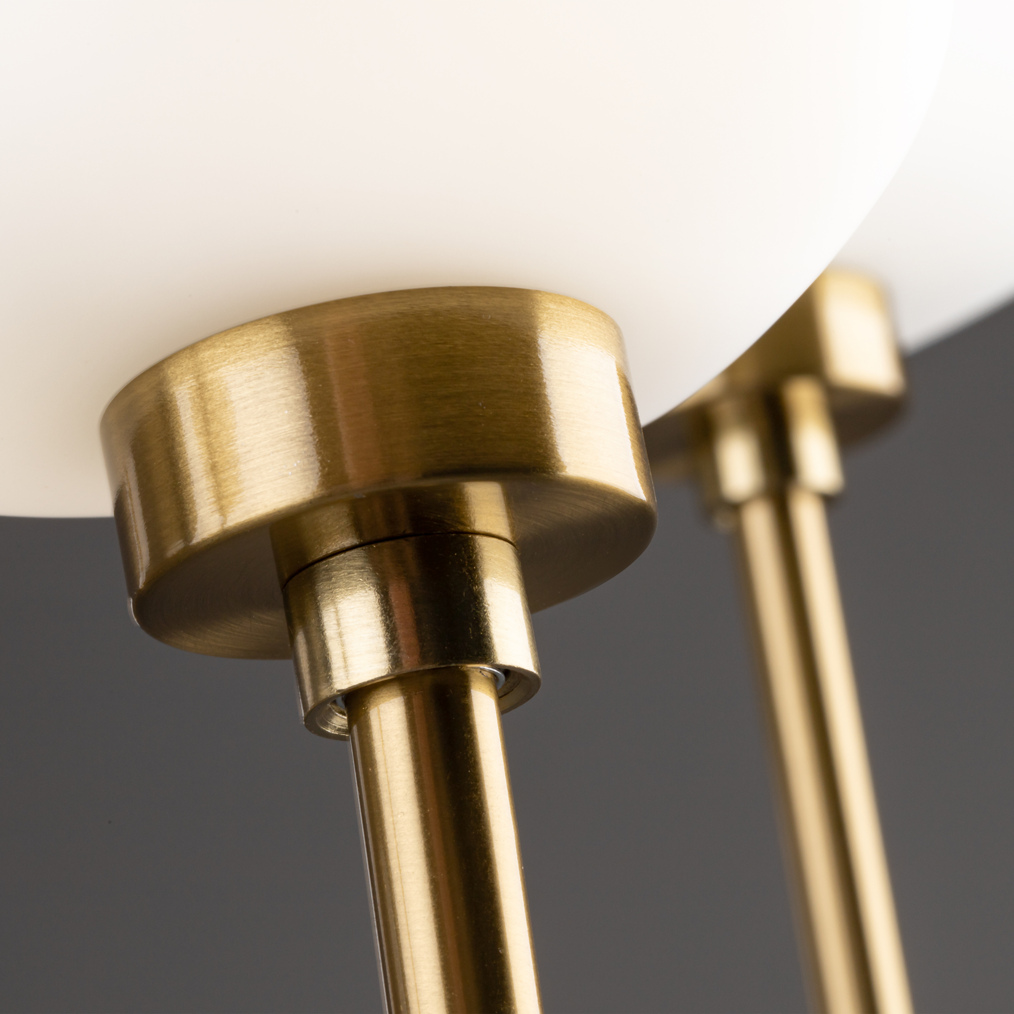 Металлическая графичная арматура цвета латунь. Плафоны из белого матового стекла в необычной форме округлых кубов - закреплены на разной по высоте комбинации. Мягкое равномерное освещение. Источником света служит лампа с цоколем G9.