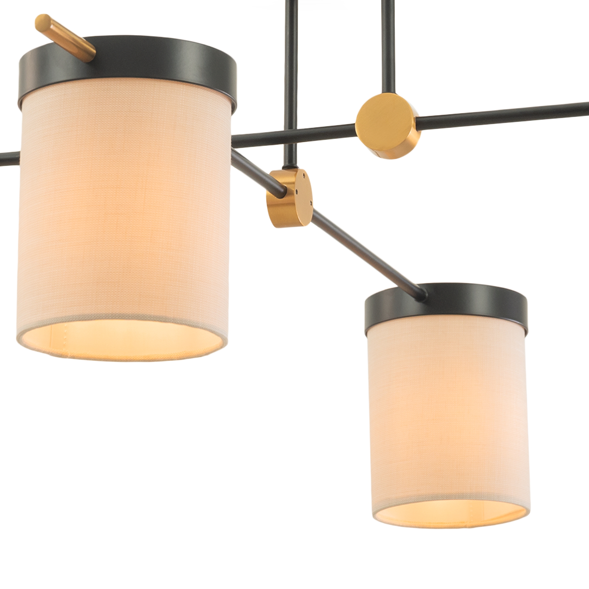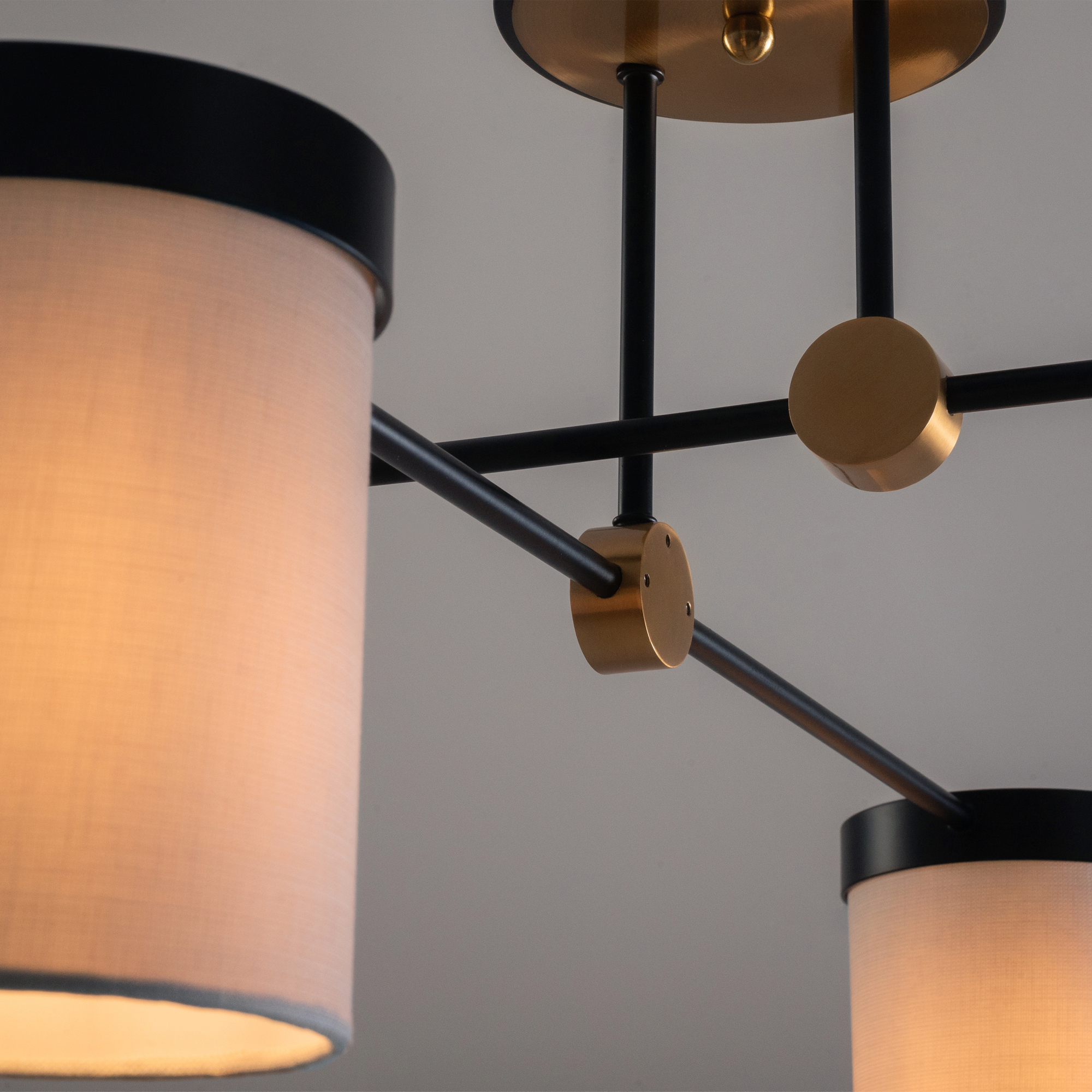 Арматура из металла. Основной цвет — чёрный, декоративные элементы в цвете латунь. Тканевые бежевые абажуры-цилиндры украшены чёрными металлическими основаниями. Компактные размеры для невысоких потолков. Источник света — лампа с цоколем Е14.