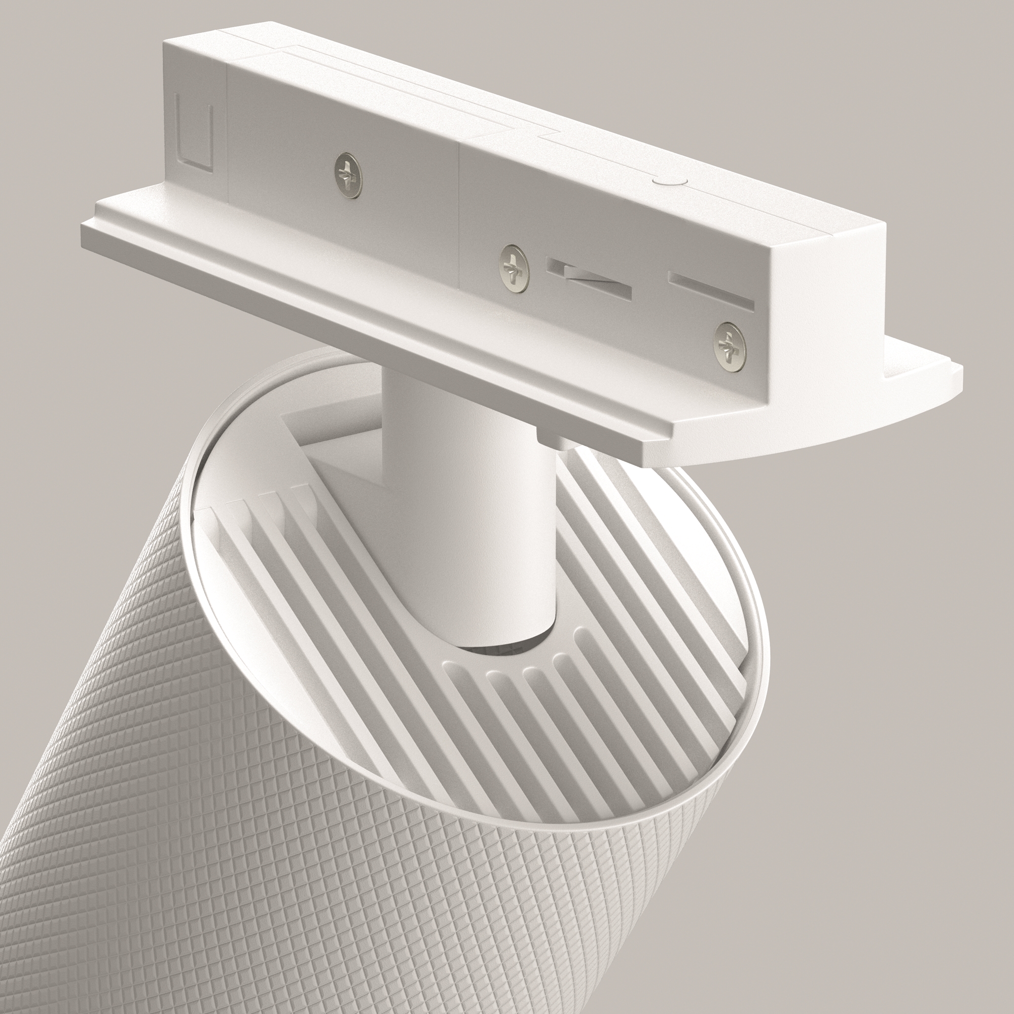 Металлический корпус, цвета - чёрный, белый, матовое золото. Цилиндрический плафон с графичной фактурой в виде ромбиков. Фиксирующее лампу кольцо скрывает кромку лампы. Утопленный источник света обеспечивает визуальный комфорт для глаз, а антибликовый фильтр HoneyComb-D45 - низкий коэффициент слепимости. Плоский компактный коннектор незаметный в шинопроводе. Поворотная система позволяет менять направление светового потока в двух плоскостях - 355 градусов вокруг своей оси и наклоном на 90 градусов в горизонтальной плоскости. Источник света - сменная лампа с цоколем GU10. Лампа и антибликовый фильтр в комплект не входят, приобретаются отдельно.