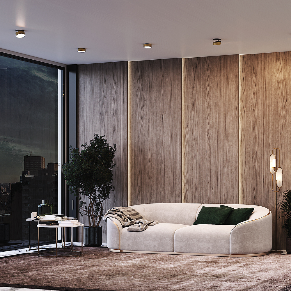 Материал корпуса – металл; цвет – белый, чёрный или сочетание чёрного цвета и матового золота. Горизонтальный и вертикальный поворотный механизм. Матовый рассеиватель. LED-источник света. Два варианта мощности (12W и 18W) и цветовой температуры (3000К, 4000К). Три модели мощностью 12W - биодинамические. Широкий угол рассеивания 120°. Совместимость с драйверами DALI и Triac для изменения цветовой температуры и диммирования.